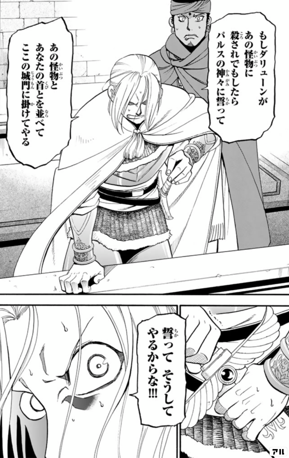 もしダリューンがあの怪物に殺されでもしたらパルスの神々に誓ってあの怪物とあなたの首とを並べてここの城門に掛けてやる 誓ってそうしてやるからな アルスラーン戦記 アル